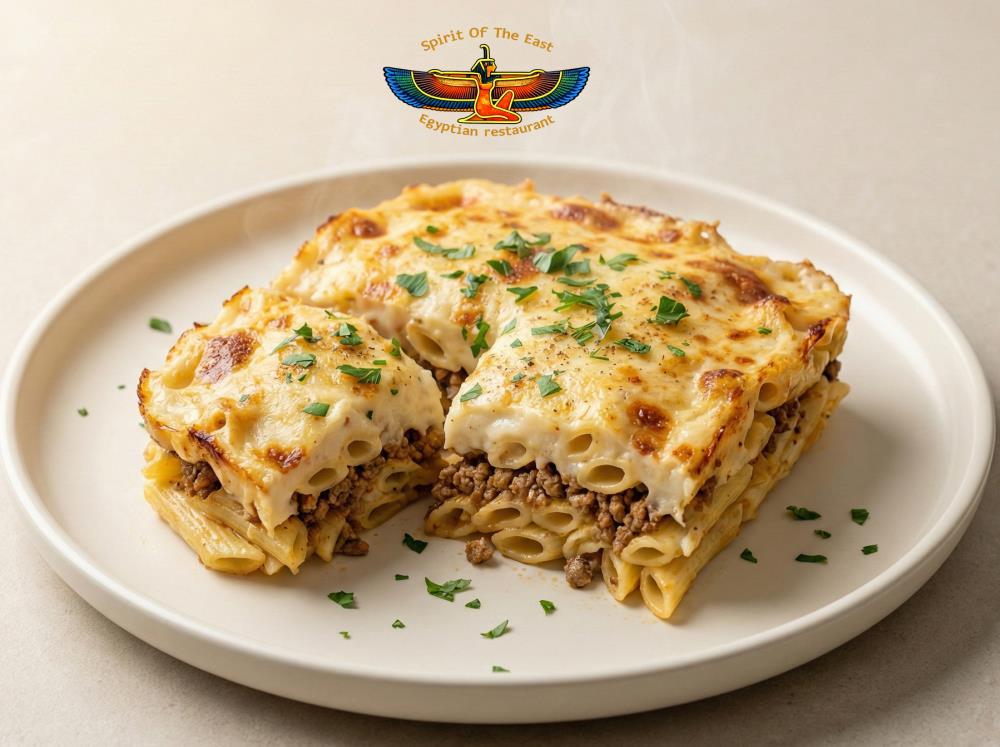 Baked macaroni with bechamel topping.