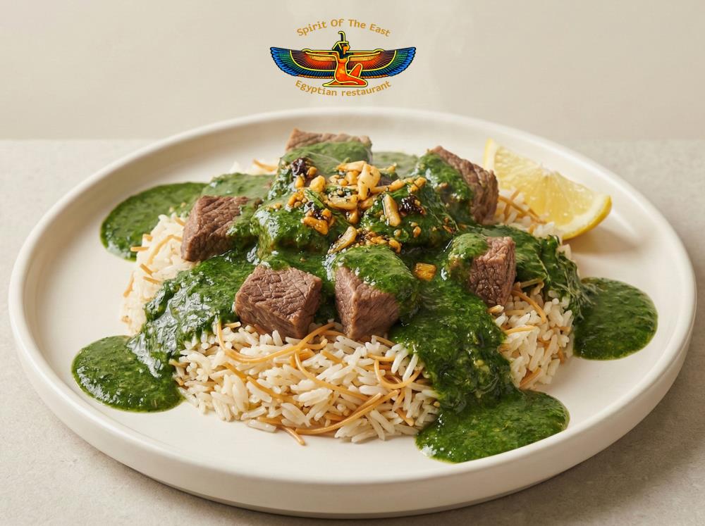 This variation of molokheya includes rice and tender meat, offering a hearty and traditional plate. The combination provides warmth and satisfaction, making it suitable for guests seeking a filling meal.