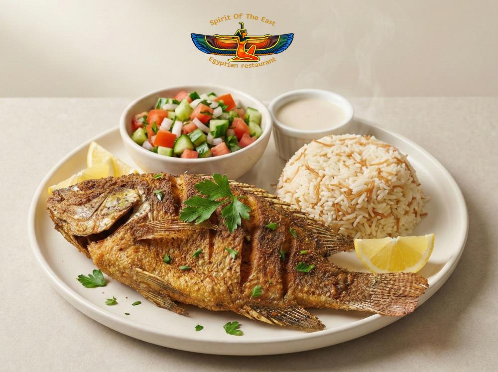This complete meal features fried tilapia paired with rice, fresh salad, and sauce for added flavor. The combination creates a balanced plate that includes protein, grains, and freshness. It’s an ideal option for guests looking for a full seafood meal in one serving.