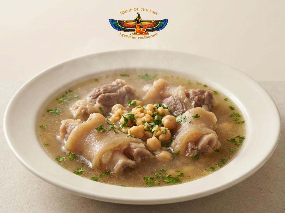 Cow Feet Soup is a hearty and traditional dish known for its depth and satisfying warmth. Prepared to deliver balanced seasoning and a rich texture, it offers a filling option for guests seeking authentic Egyptian flavor. This soup is ideal as a standalone meal or paired with other dishes for a complete dining experience.
