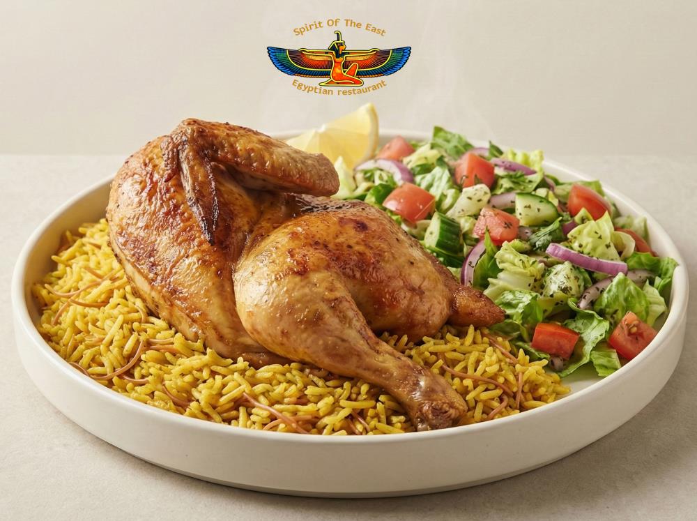 This generous platter includes half a chicken paired with rice and salad. The combination provides warmth, flavor, and freshness in one complete meal. It’s designed for guests seeking a hearty option with balanced sides suitable for lunch or dinner.